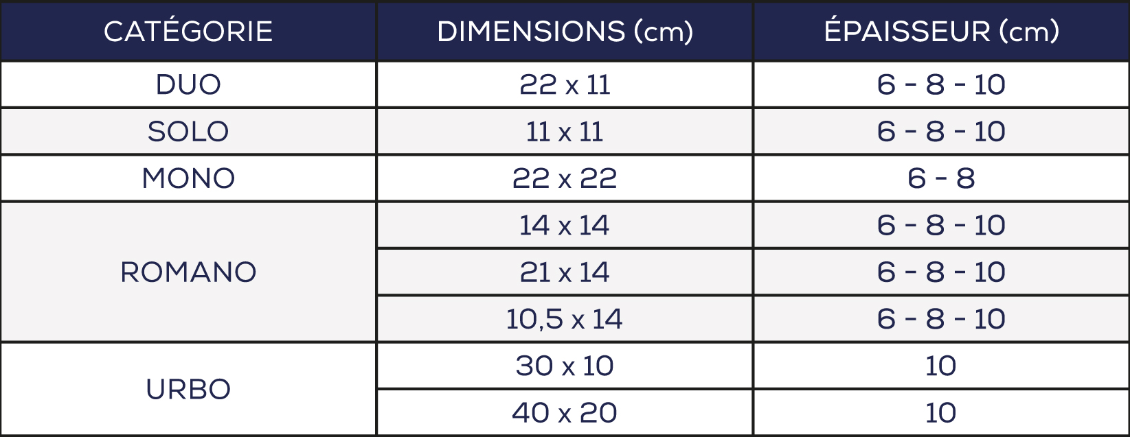 - La catégorie d’application selon NBN B 21-311 : Ia (ép. ≥ 80mm) ou IIa (ép. < 80mm) car resistants au gel, dégel et aux sels de déverglaçage.