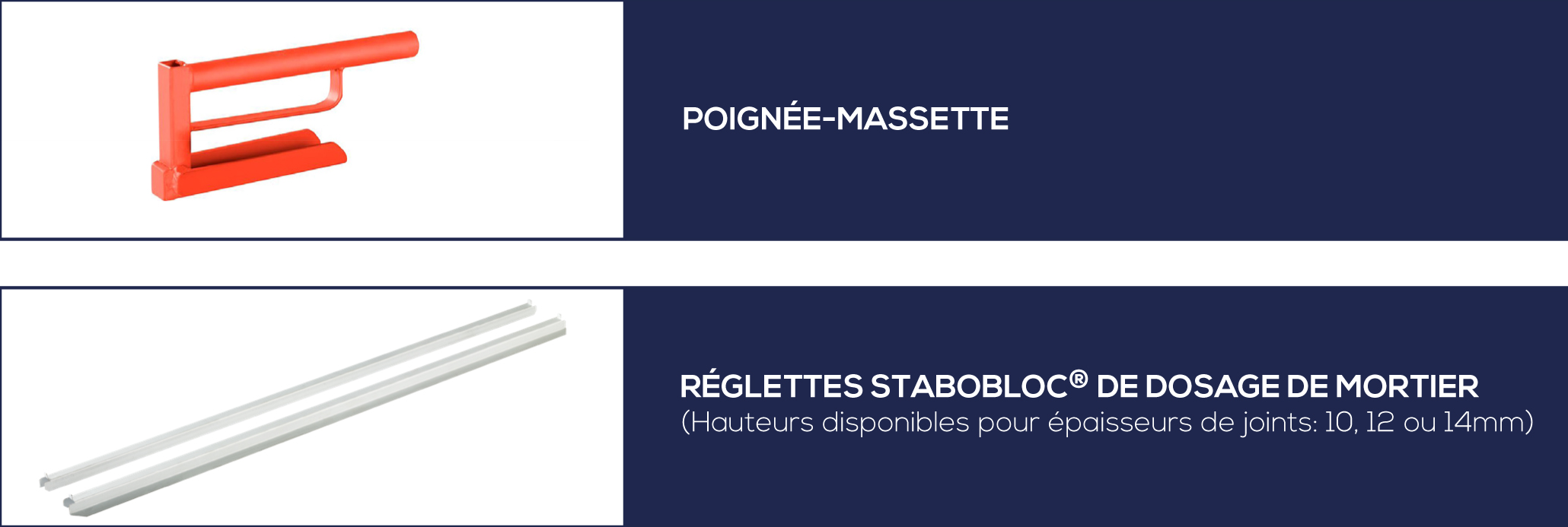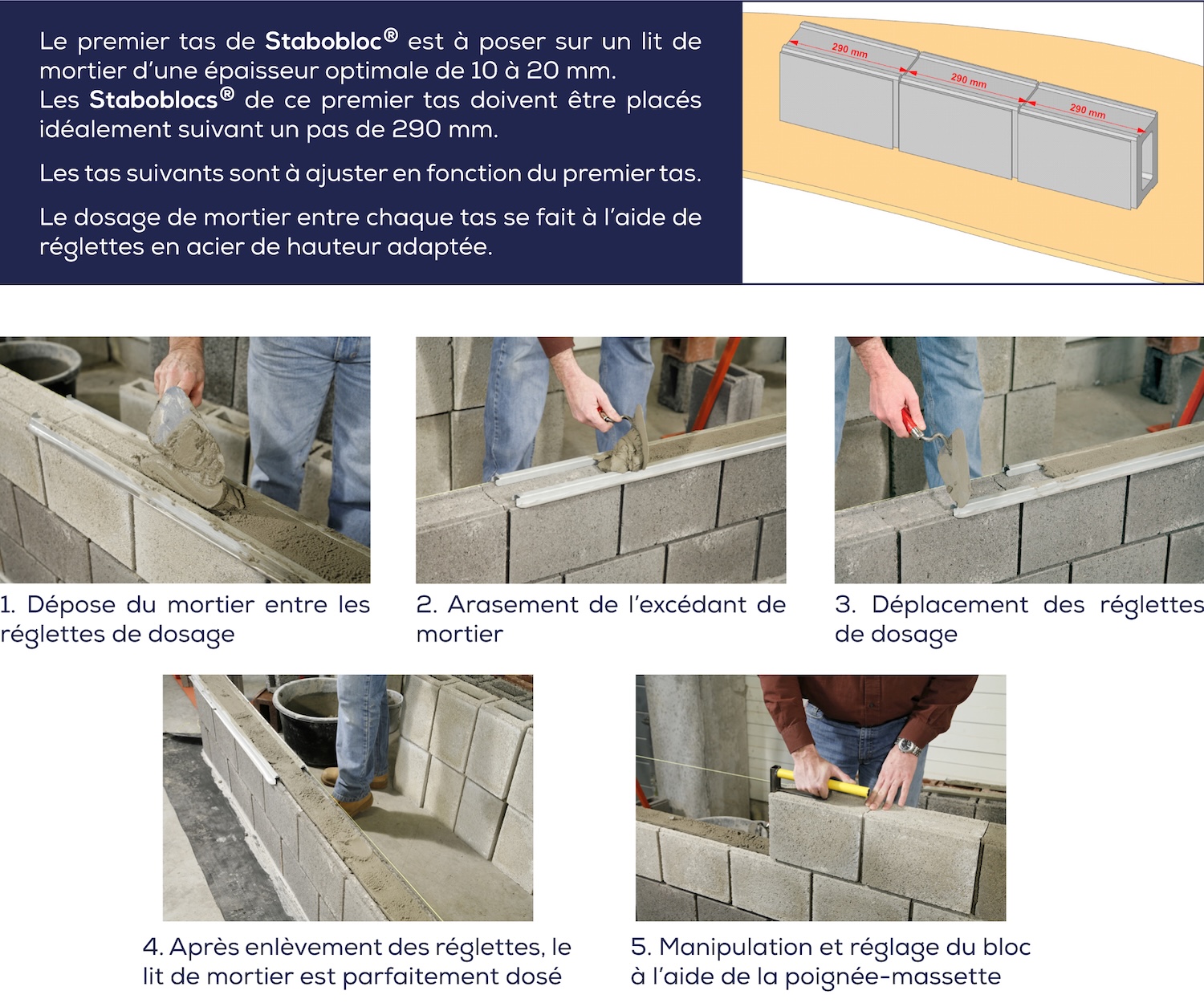 Le concept STABOBLOC permet de réaliser facilement et économiquement les murs. Grâce au système de dosage automatique de mortier, vous réalisez des faces de mur bien propres et sans débordements de mortier.